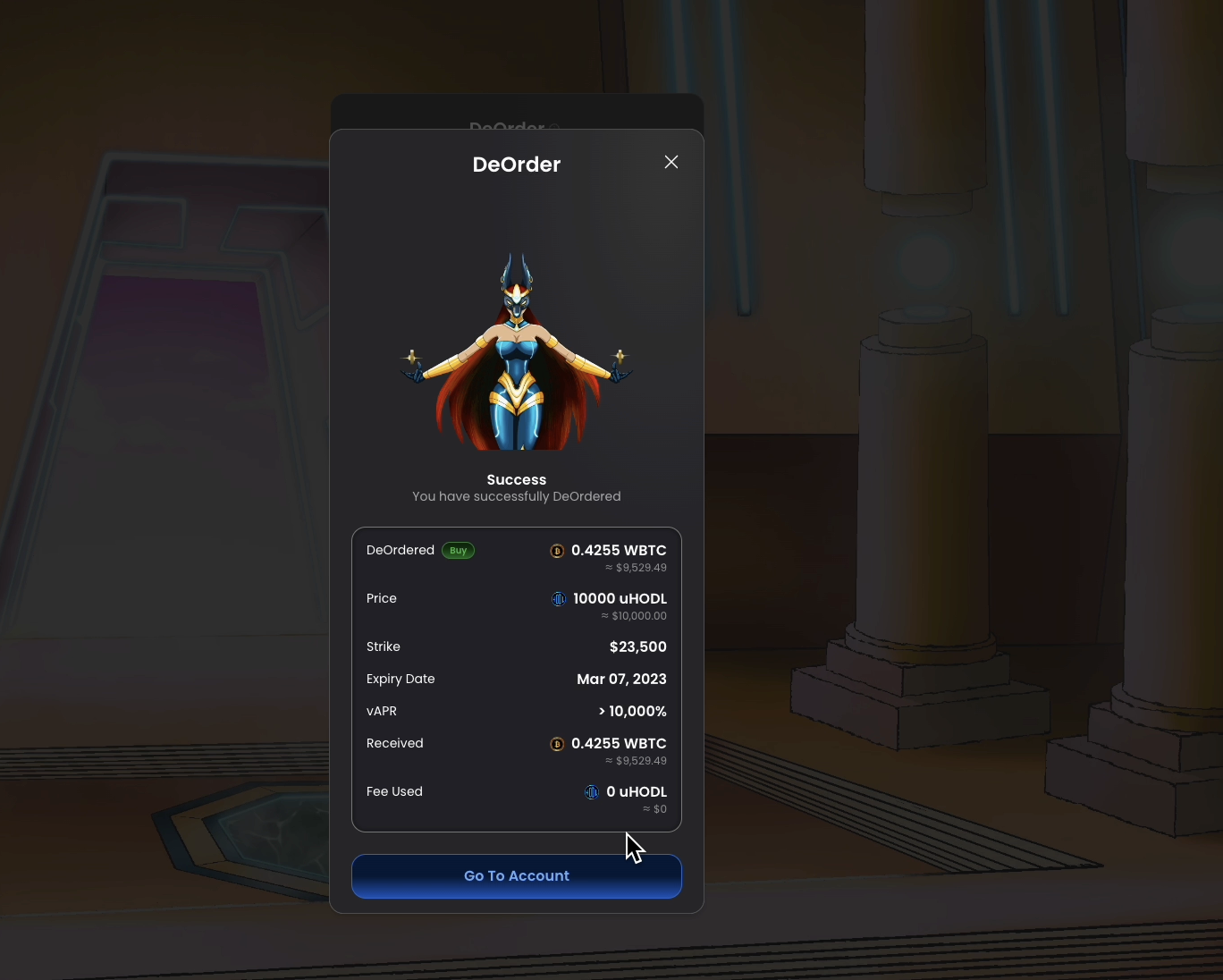 7. Once the transaction has successfully gone through, you'll receive a pop-up of the Goddess Dobia showering you with $DOB rewards, as well as a detailed summary of the full transaction details.