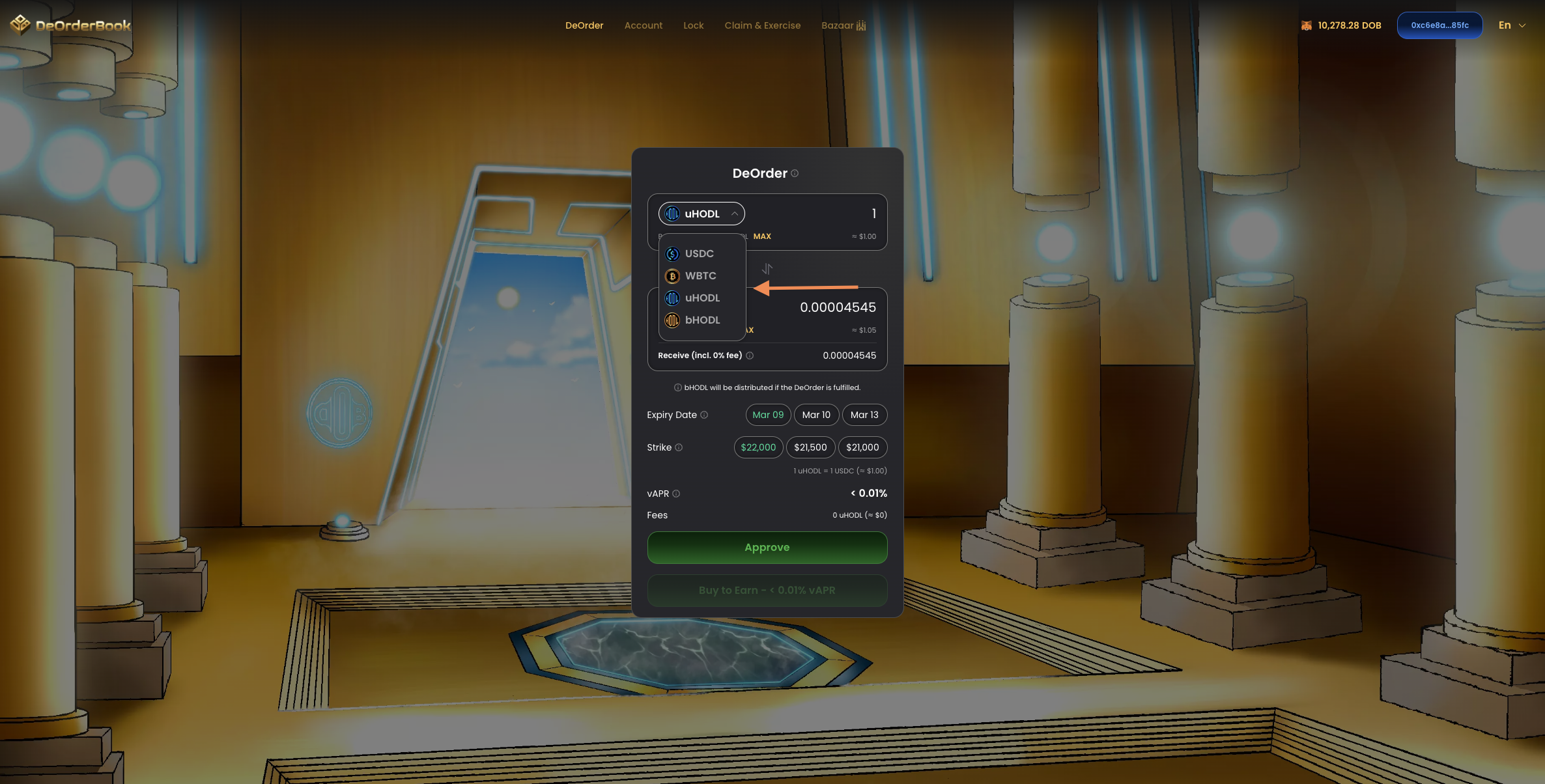 <figure><img src="https://content.gitbook.com/content/BsnGpEEb8OMmsJGOe82I/blobs/HIyVUzsfsUSSH4YO3Eap/Screenshot%202023-03-08%20at%201.56.01%20PM.png" alt=""><figcaption><p>Select the right HODL token for the DeOrder type you want</p></figcaption></figure>