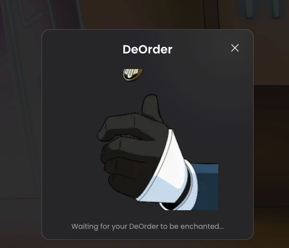 You'll see a coin flipping animation start as the network processes your DeOrder. It might take a while: but don't worry, networks get clogged sometimes but your transaction will go through soon!