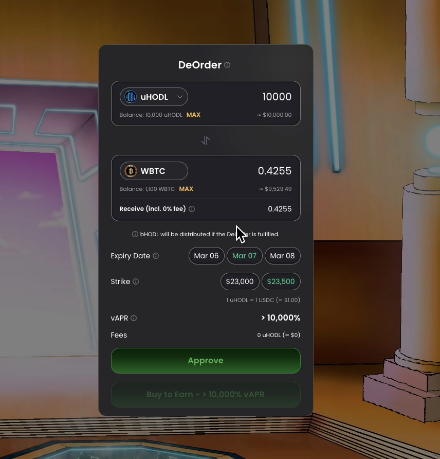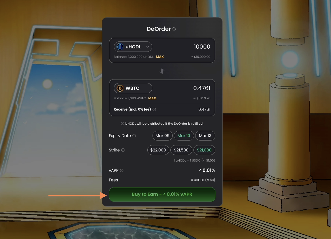 **You'll need to mint $uHODL tokens from $USDC to place a Deorder/Buy.**
