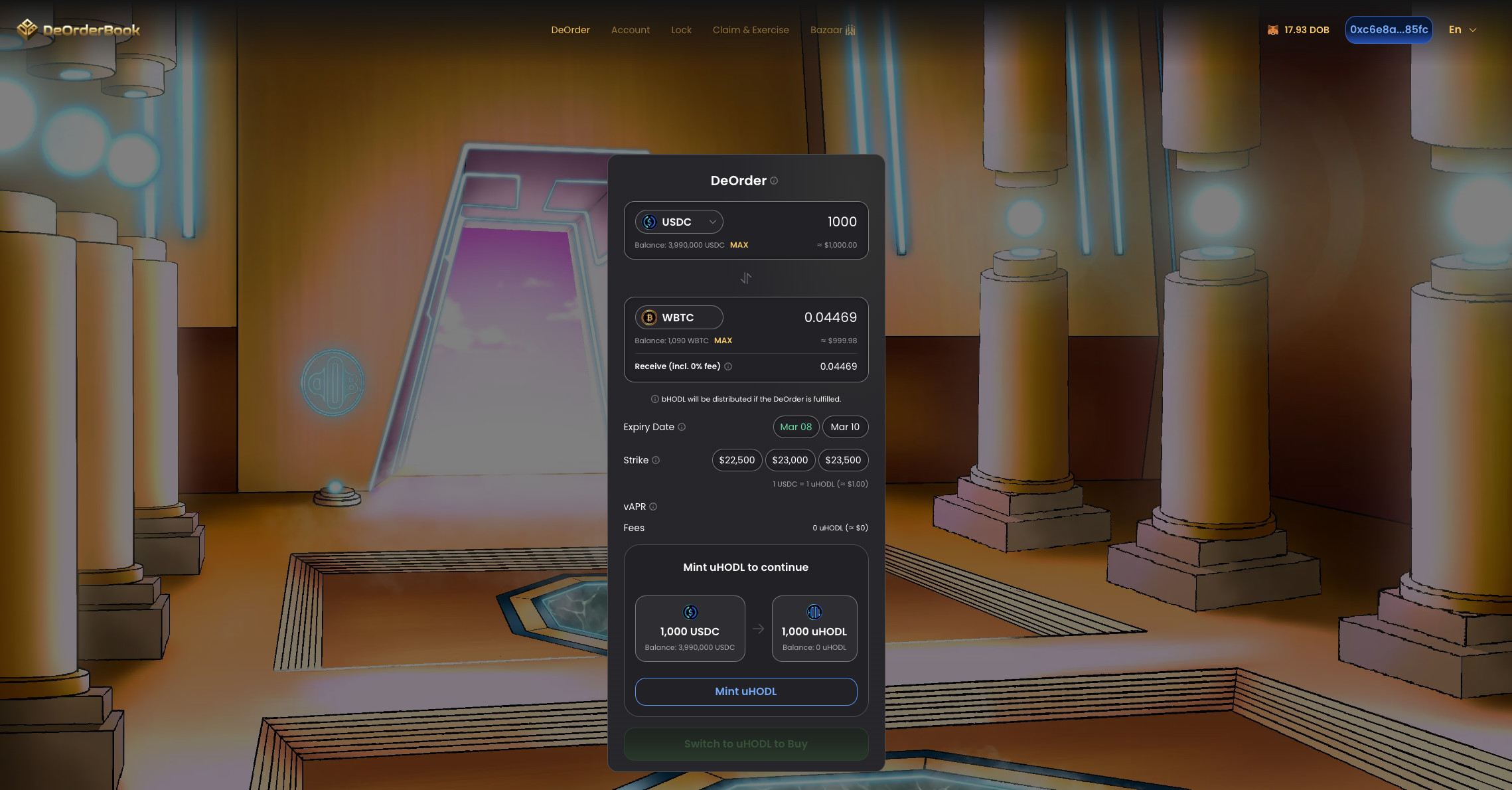 <figure><img src="https://content.gitbook.com/content/BsnGpEEb8OMmsJGOe82I/blobs/pv2e7h5BSQIwEcJZG8EZ/Screenshot%202023-03-07%20at%205.56.15%20PM.png" alt=""><figcaption><p>Users are prompted to mint HODL tokens before being able to place a DeOrders</p></figcaption></figure>
