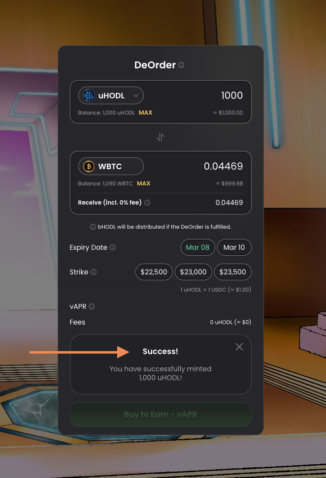 Now that uHODL tokens have been minted, users a ready to place a DeOrder.