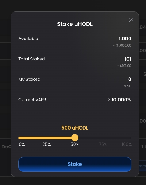 A pop-up will appear, showing you the amount of HODL tokens you have available and the current vAPR you can earn from staking. Use the slider to select the percentage HODL tokens you want to stake. When you're satisfied, click the 'Stake' button.