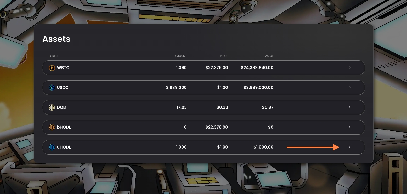 Look for the HODL token type you'd like to stake, then click on the small white arrow to the right to see a drop-down menu describing all the actions you can take with your HODL tokens.
