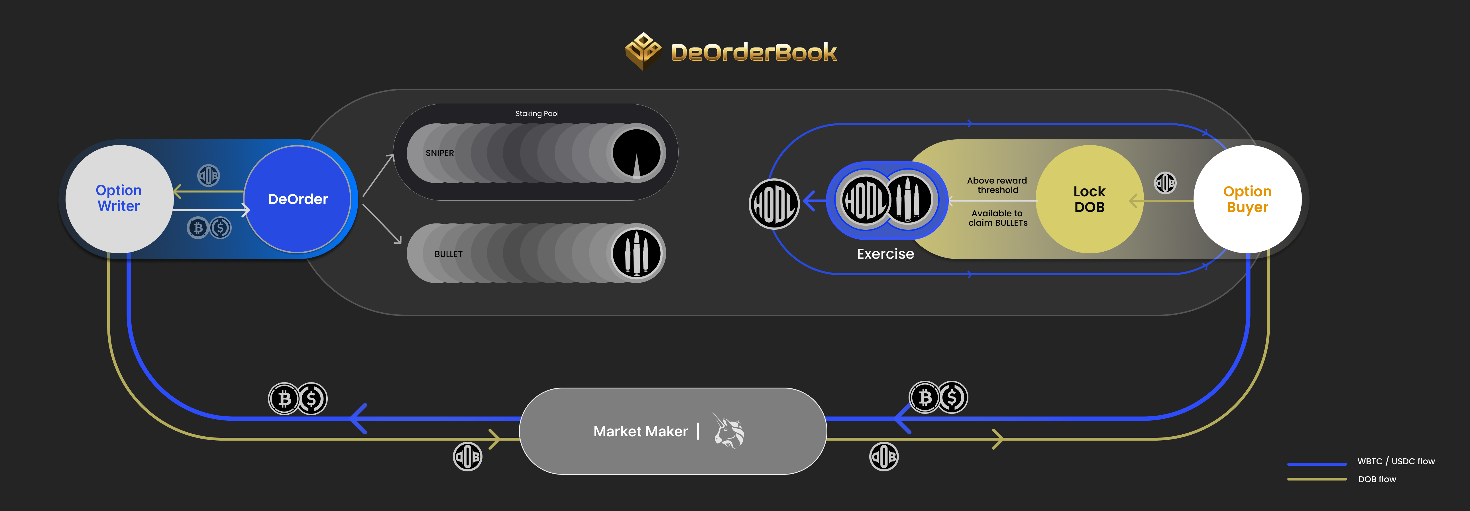 * [BULLET](https://docs.deorderbook.com/sniper-and-bullet/explaining-sniper-and-bullet#what-are-bullet-tokens): An option right token, generated in tandem with SNIPER tokens. These are awarded to eligible [$DOB lockers](https://docs.deorderbook.com/usddob/locking-usddob), and have the unique property of being able to exercise DeOrders. Tradable at the [BULLET Bazaar](https://docs.deorderbook.com/sniper-and-bullet/bullet-bazaar).