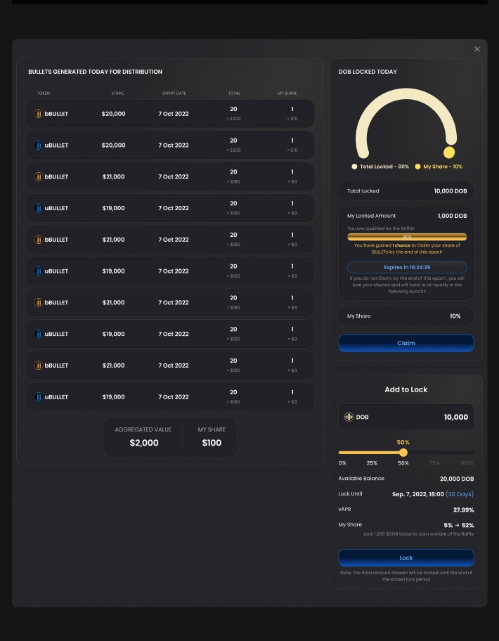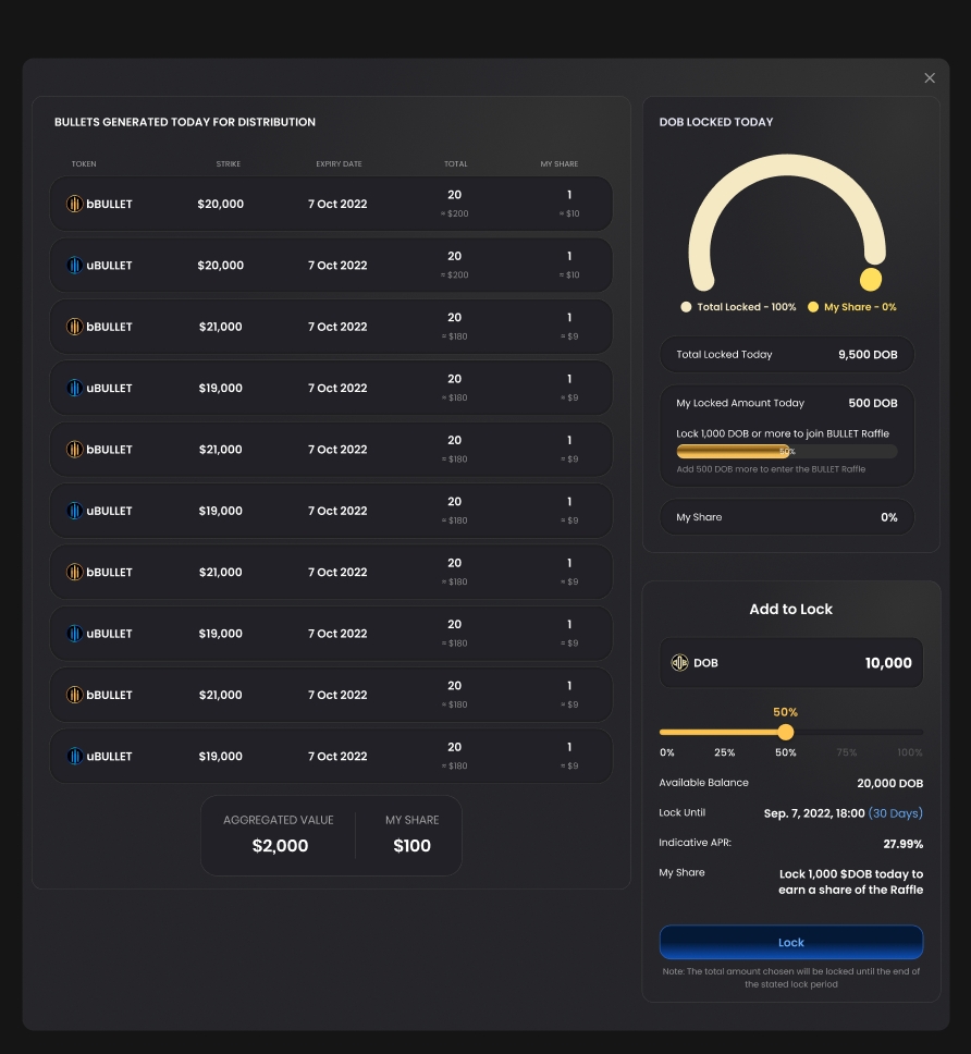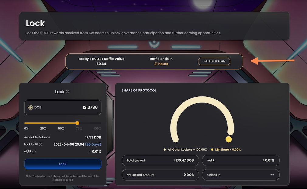 Locking $DOB allows for two types of rewards. One of these rewards is the ability to manually claim a share of BULLET tokens from a daily BULLET Raffle.