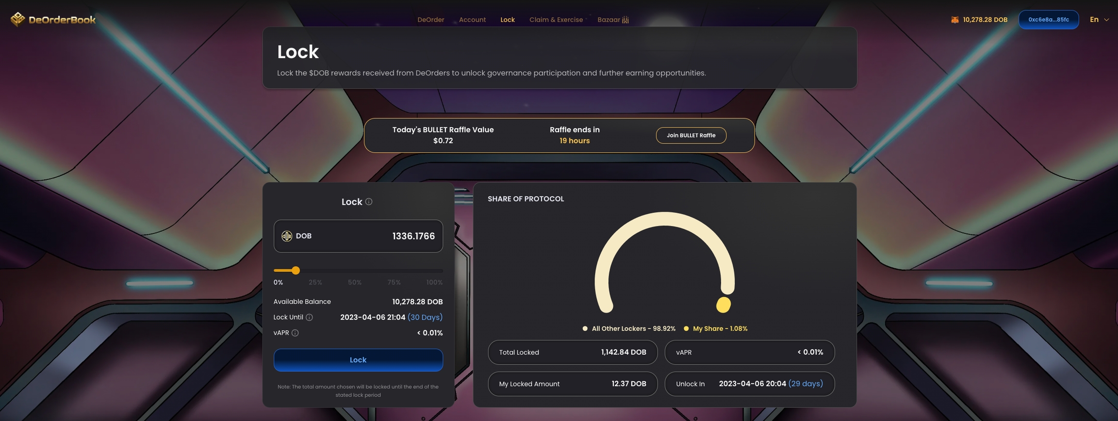 On the left side of the Lock page, you will see a window prompting you to select an amount of $DOB to lock. You may either manually enter a value in the text window, or use the slider to select a percentage of your available
